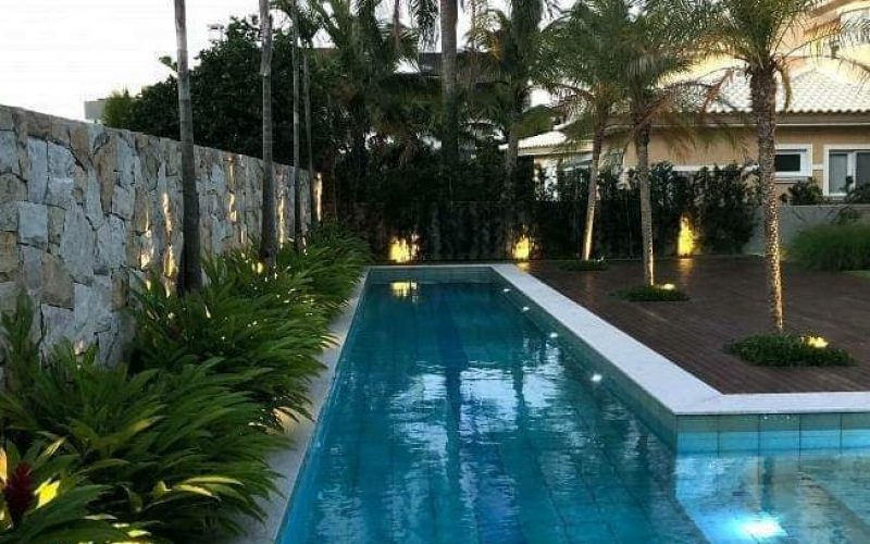 • Piscina em concreto armado com raia de 17 metros, espelho d’água, escada e iluminação noturna, ideal para momentos de lazer.