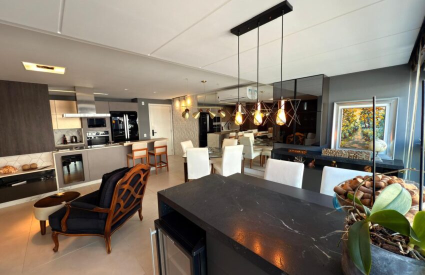 Magnífico apartamento, todo montado e mobiliado (eletro-eletrônicos e armários), sendo ampla sala com churrasqueira na varanda, integrada à cozinha equipada e com armários, lavabo, 3 suítes, área de serviço e 2 garagens.Prédio com salão de festas, bicicletário, piscina, banheira de SPA, salão de festas e sauna.