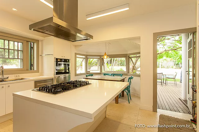 A cozinha bem equipada, com vista ao jardim, possui uma bay-window que convida a um longo café da manhã. Todo o espaço proporciona um estilo de vida de conforto, lazer e proximidade à natureza.