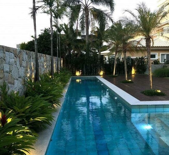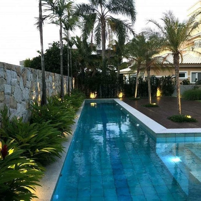 Piscina com raia de 17 metros, espelho d´água, escada e iluminação noturna;