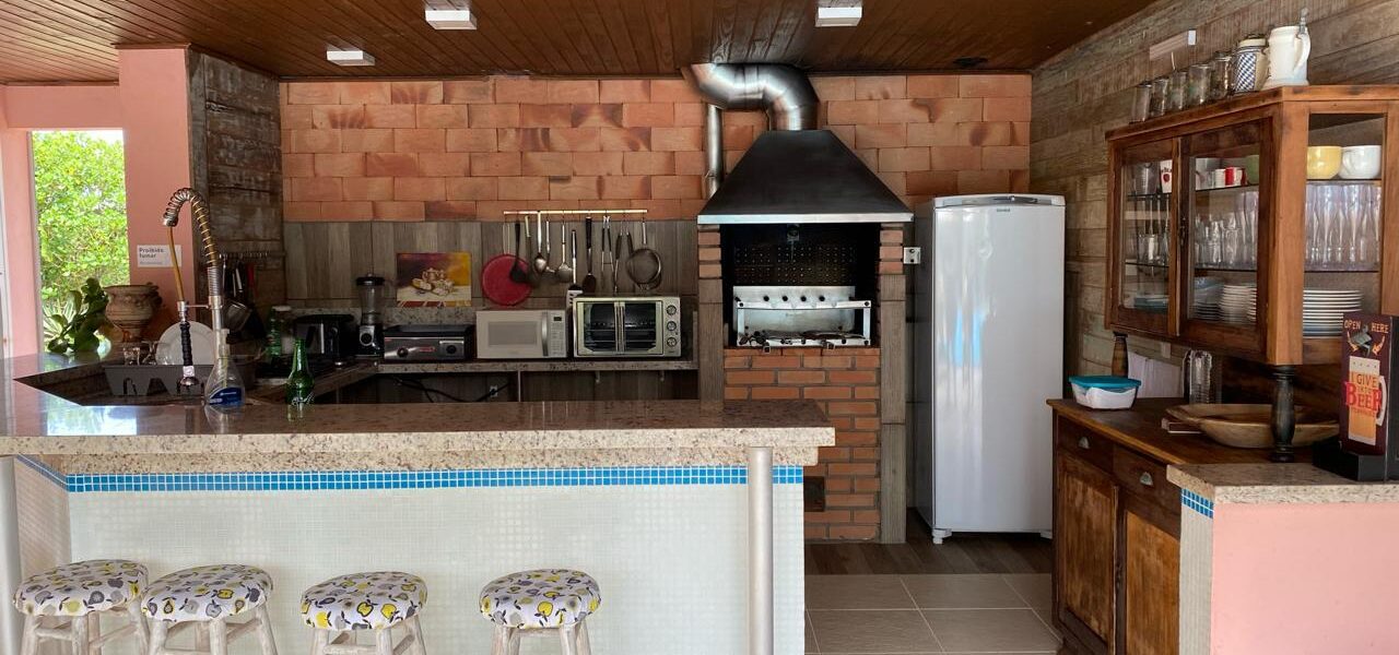 Espaço bem grande de jardim, o terreno é em frente a praia, menos de 10 metros da água do mar, com áreas externas, ótimas pra sentar e tomar um café, jogar um carteado, bater um papo com os pés na grama e um barulhinho de mar, tomar um banho de piscina, fazer um churrasco!